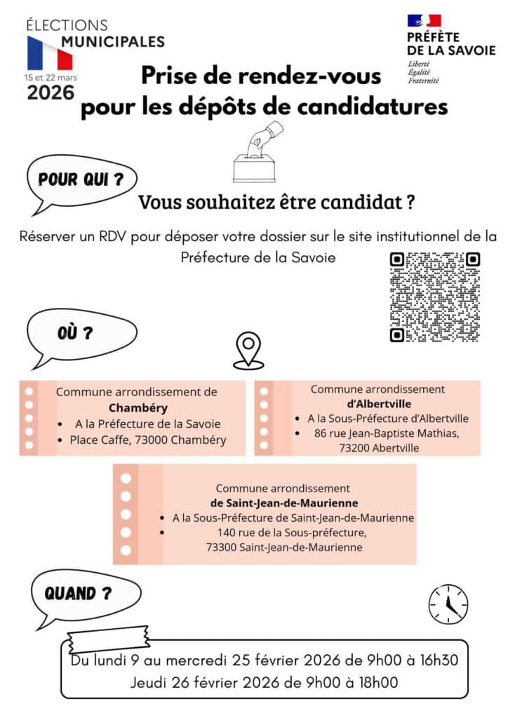 Les candidats aux élections municipales 2026 doivent prendre un rendez-vous auprès de la sous-Préfecture d'Albertville afin de pouvoir déposer leur dossier.
