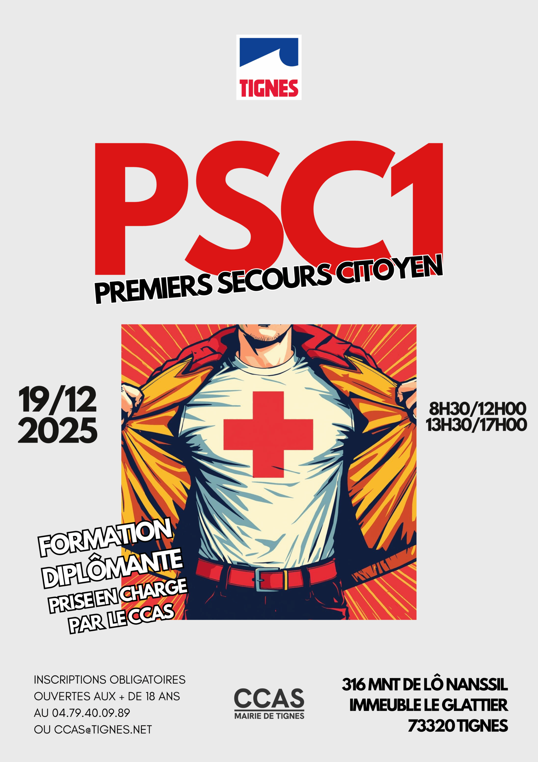 Une formation PSC1 aura lieu le vendredi 19 décembre de 08h30 à 17h00 au Pôle Social de Tignes.
