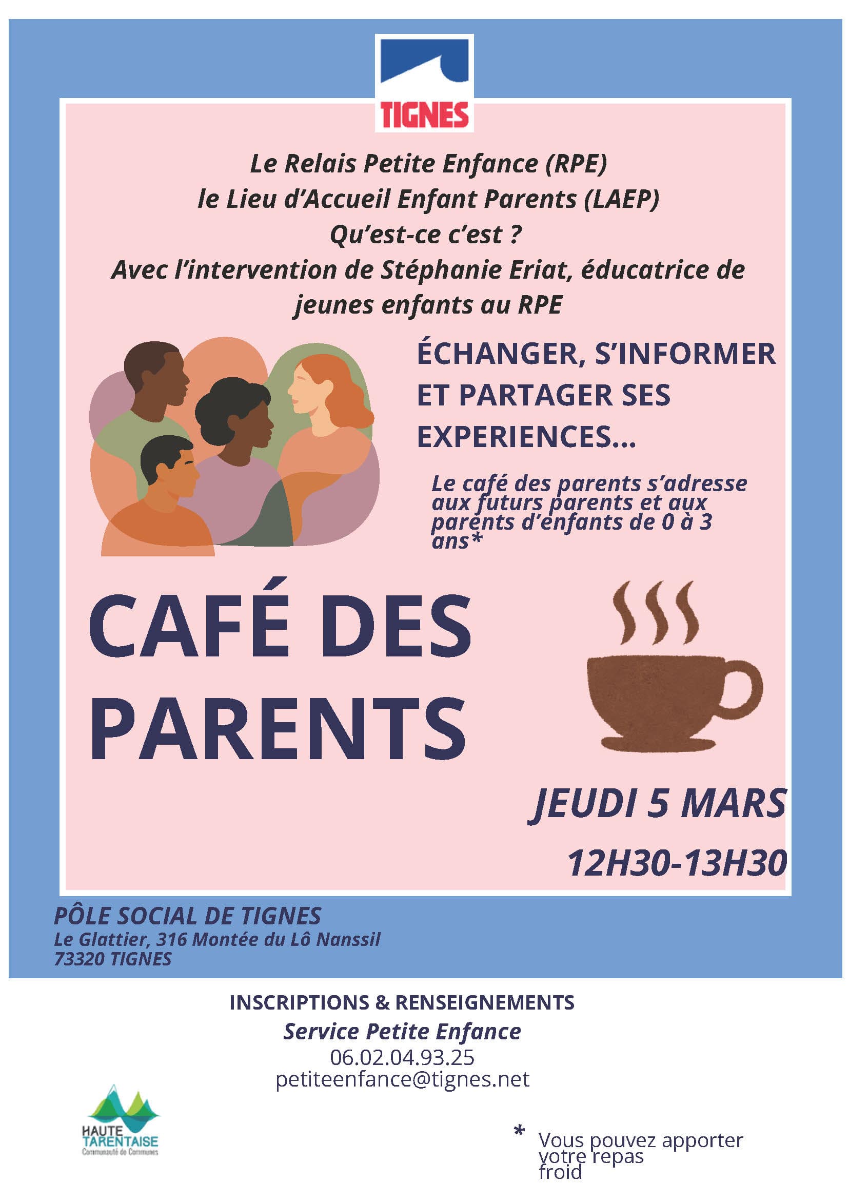 Un café des parents aura lieu le jeudi 5 mars de 12h30 à 13h30 au Pôle Social de Tignes (immeuble le Glattier).