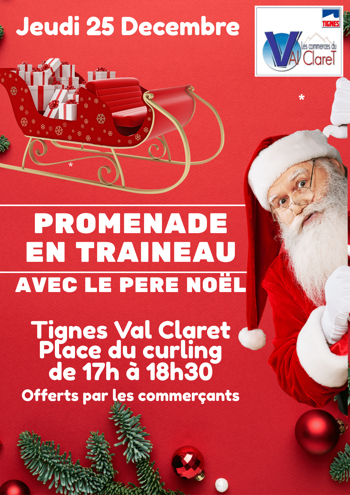 - 17h00 – 18h30 : Promenade en traîneau avec le Père Noël, offert par les Commerçants du Val Claret Centre – Rendez-vous sur la Place du Curling (Tignes Val Claret)