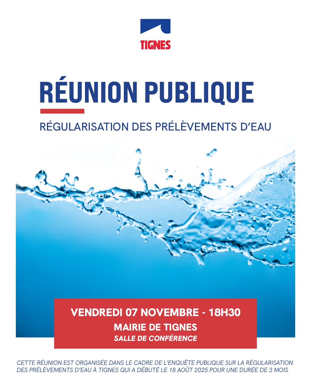 La réunion publique de clôture concernant l'enquête sur la régularisation des prélèvements d'eau à Tignes se tiendra le vendredi 7 novembre à 18h30 en salle de conférence de la mairie.
