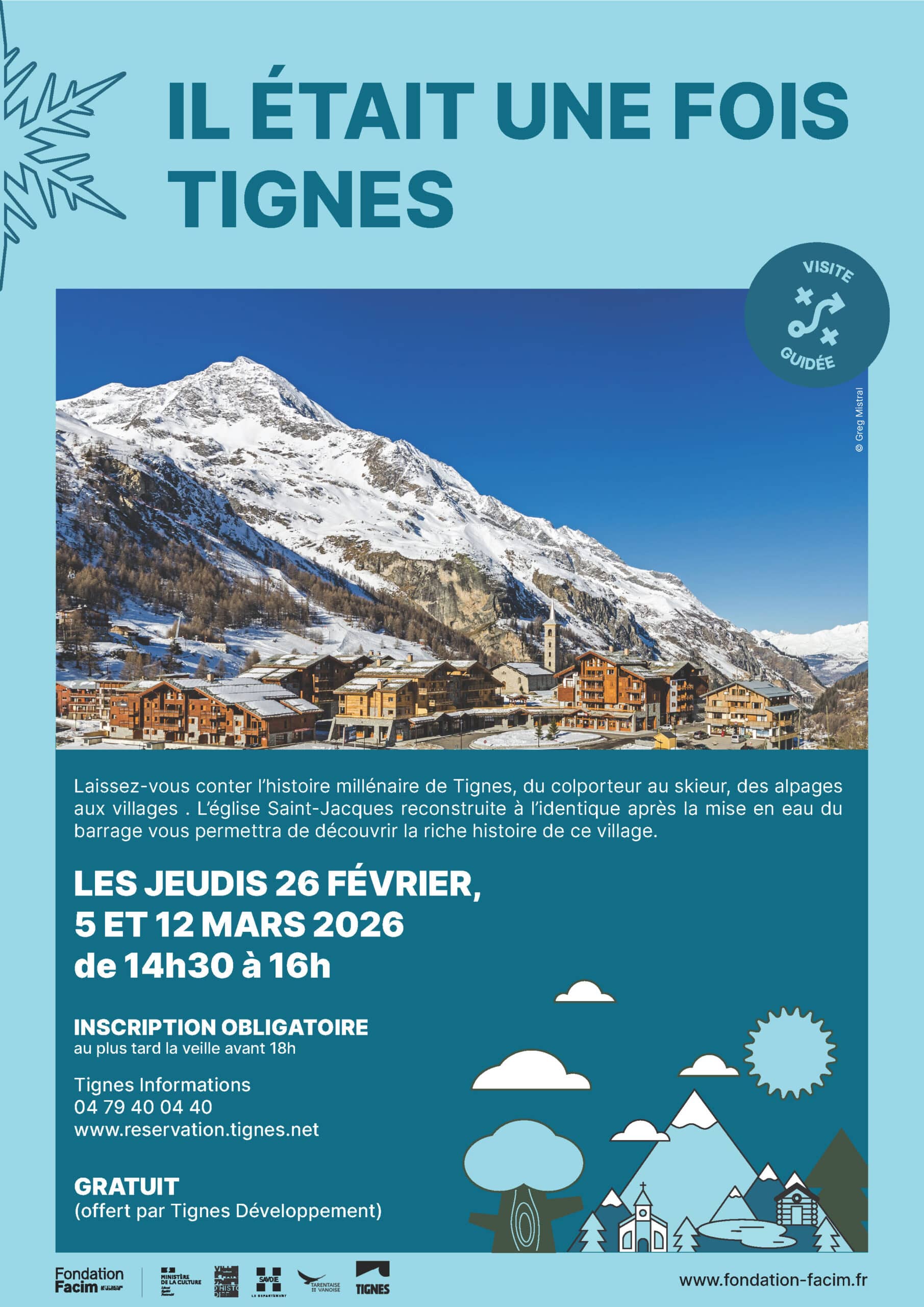 La visite guidée "Il était une fois Tignes" aura lieu le jeudi 12 mars 2026 de 14h30 à 16h :