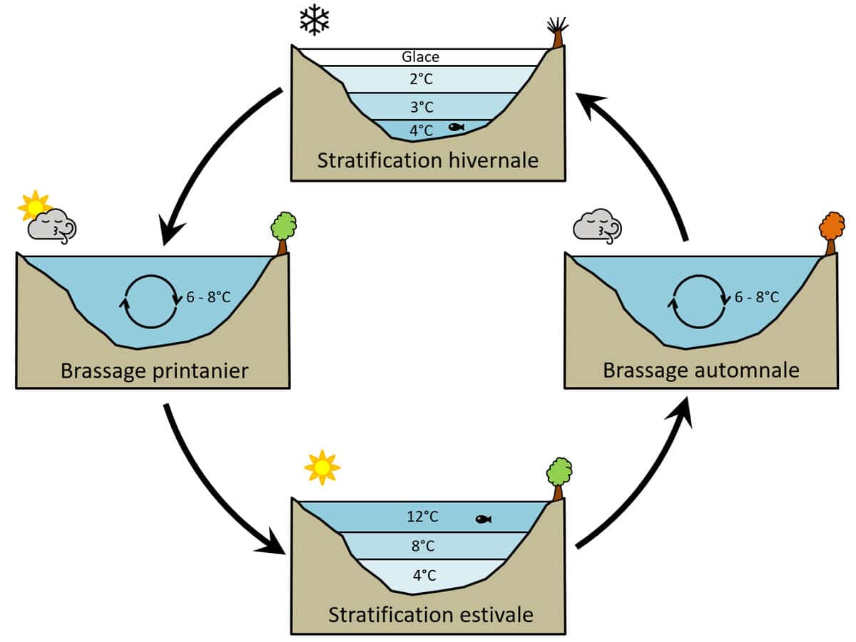La température représente l’effet majeur sur la dynamique du lac, les périodes de réchauffement ou de refroidissement conditionnent le mélange ou la stratification des eaux (voir figure 2). En été, le soleil réchauffe la partie supérieure du lac et on observe une stratification thermique de ce dernier. L’action du vent et le refroidissement de l’atmosphère permettent un brassage automnal des eaux ; la température dans le lac s’homogénéise progressivement. En période hivernale, lorsque l’eau du lac est suffisamment froide (environ 4°C), on observe une stratification thermique inversée qui est accompagnée du gel de la surface du lac. Au printemps, le réchauffement et le vent permettent de remélanger des eaux et le cycle se répète d’une année sur l’autre.