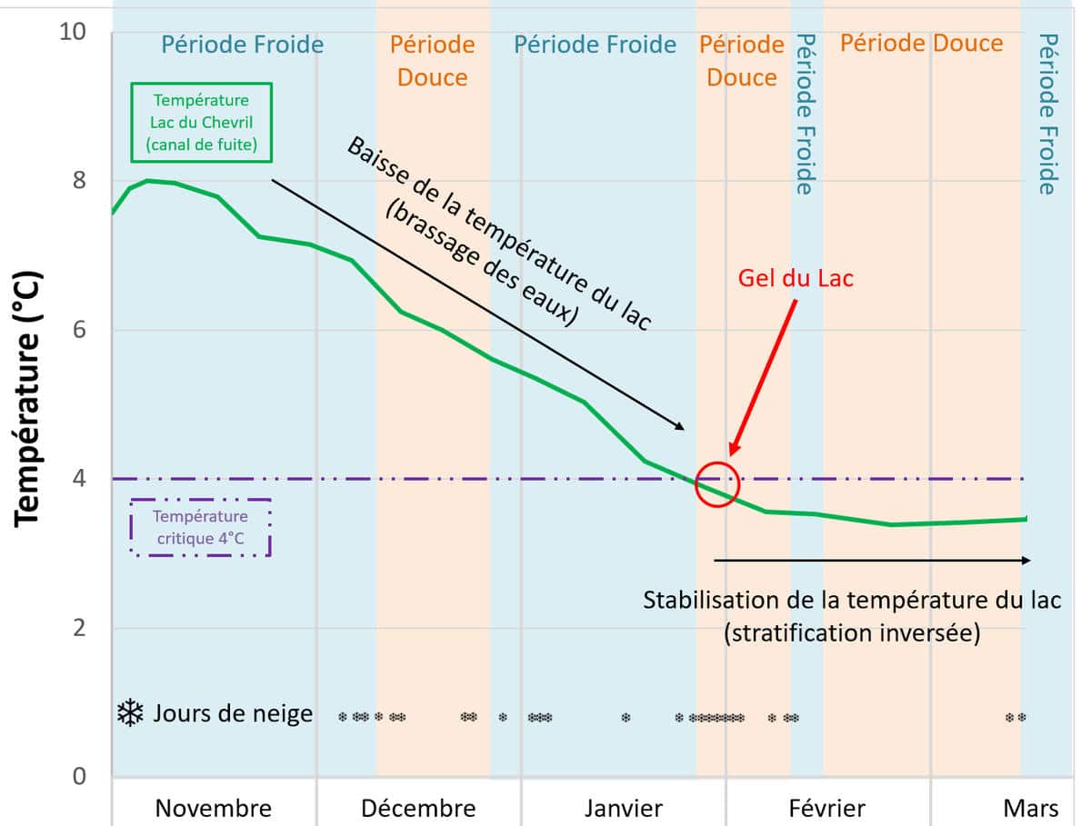 Pourquoi le lac du Chevril a-t-il choisit la semaine la plus douce de l’hiver pour geler ? Comment expliquer ce phénomène qui peut sembler contre intuitif ? Pourquoi observe-t-on un basculement du fonctionnement du lac à partir de 4°C ?