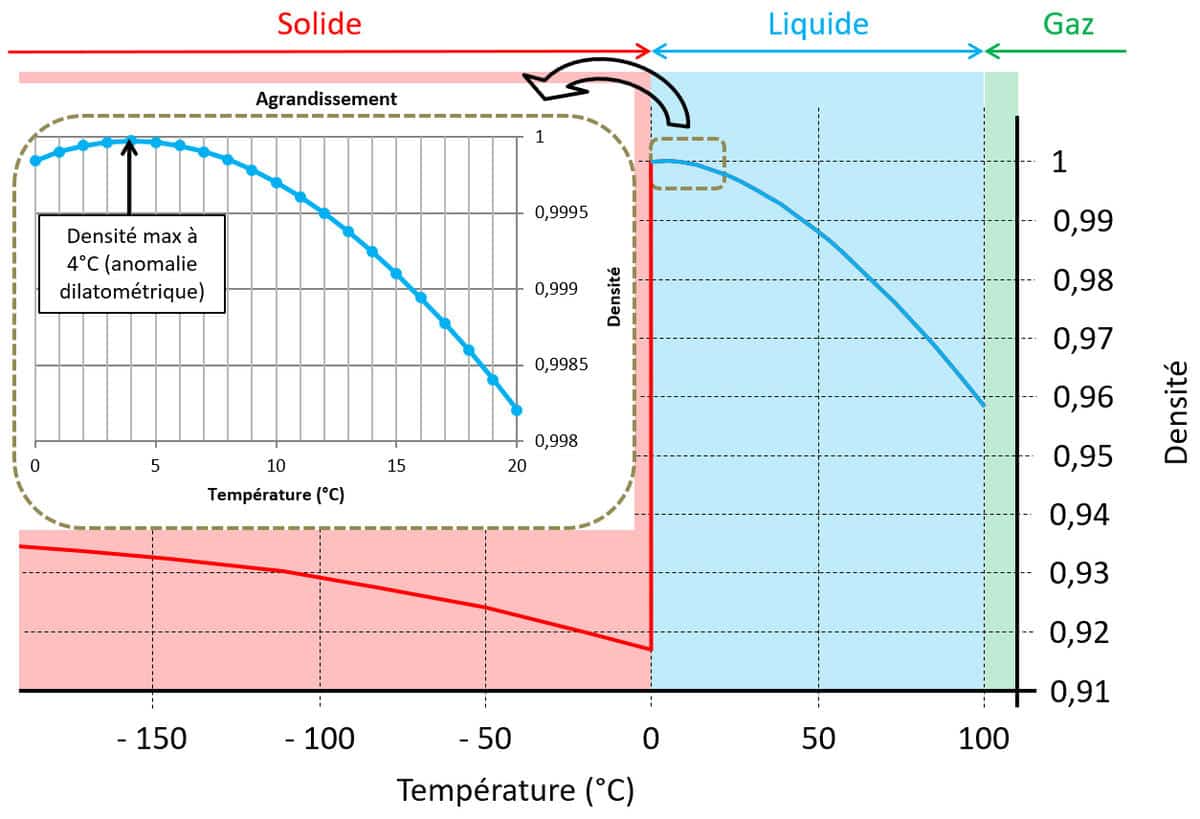 Ce phénomène est lié aux propriétés particulières de l’eau (voir figure 4 ci-après). En effet, « en règle générale, la densité d’un corps augmente lorsque sa température diminue : ainsi, dans la majeure partie des cas, plus un liquide est froid, plus il est dense, et à l’état solide un corps est aussi généralement plus dense qu’à l’état liquide. Or, l’eau représente une exception à cette règle (appelée « anomalie dilatométrique ») : si, à température ordinaire, l’eau devient plus dense lorsque la température diminue, cette tendance s’inverse entre 4°C et 0°C : à partir de 4°C, l’eau se dilate en se refroidissant » [Bonnet, 2005] et [Fizeau, 1866]. Ainsi quand la température moyenne du lac atteint environ 4°C, le froid ne peut plus descendre en profondeur (convection stoppée) et reste bloqué en surface pour permettre la formation de la glace. La glace étant elle-même moins dense que l’eau va flotter sur cette dernière, c’est également pour cette raison que l’eau gèle d’abord par le dessus contrairement à l’huile.